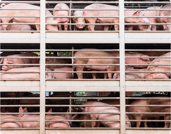 When the time comes to be sent to slaughter, animals are gathered and loaded onto trucks where they endure long journeys without food, water, or rest. Many arrive at the slaughterhouse weak, injured, or dead. Their final hours are often their most agonizing as they suffer rough handling, terrifying environments, and grisly deaths.